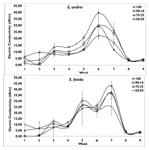 Figure 5: Behavior of electrical conductivity in EUs with the species E. andrei and E. fetida.