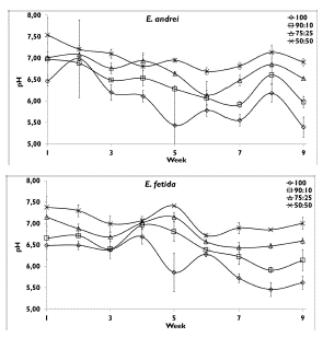and the final humidity was affected, since the treatments with higher humidity (E. fetida) showed a slight increase in pH, and treatments with lower moisture content (E. andrei) had lower pH values.