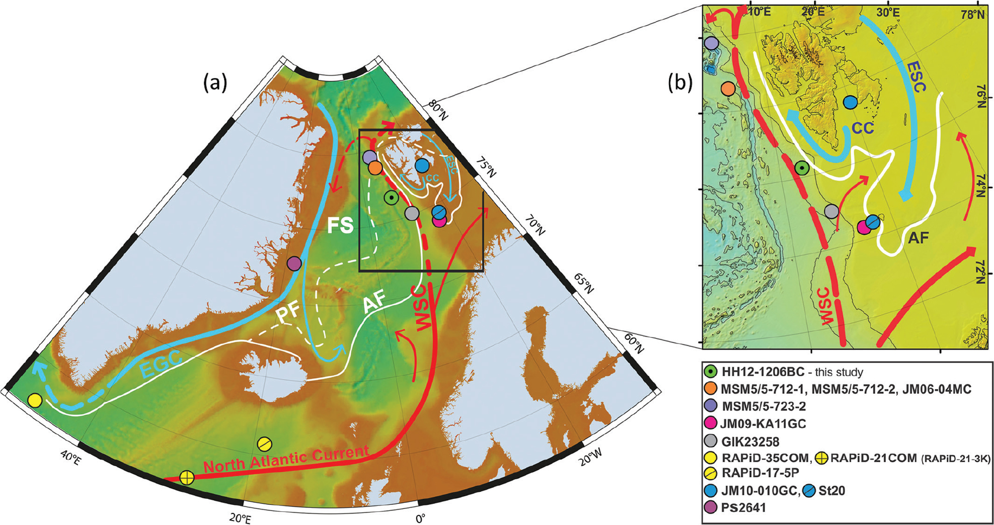 Fig. 1 (a) Schematic map of northern North Atlantic, Fram Strait and western Barents Sea showing bathymetry, present-day major surface currents and average position of Polar and Arctic fronts. (b) Close-up of western Svalbard margin, north-western Barents Sea. Solid and dashed lines indicate surface and subsurface currents, respectively. Location of core HH12-1206BC (green circle) is indicated together with published records discussed in the text (listed in legend and Supplementary Table S1). FS: Fram Strait; WSC: West Spitsbergen Current; CC: Coastal Current; ESC: East Spitsbergen Current; EGC: East Greenland Current; AF: Arctic Front; PF: Polar Front.