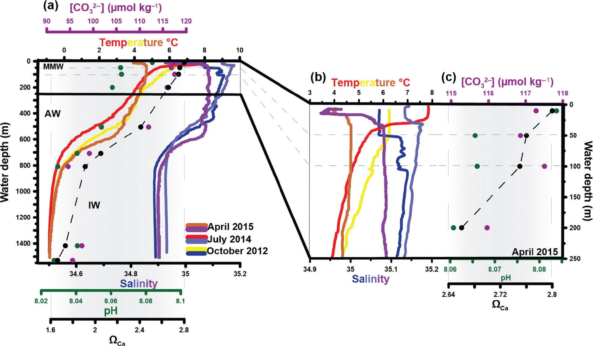Fig. 2 (a) CTD profile showing water mass distribution of the water column in October 2012, July 2014 and April 2015 at site HH12-1206BC. Carbonate chemistry parameters (pH, CO3 2–, ΩCa) for April 2015 are also shown. Range of ΩCa in the water column is indicated by grey bars. (b) Close-up of CTD data in upper 250 m. (c) Carbonate ion concentration [CO3 2–], pH and calcium carbonate saturation state (ΩCa) in upper 250 m in April 2015. MMW, mixed meltwater; AW, Atlantic Water; IW, intermediate water.