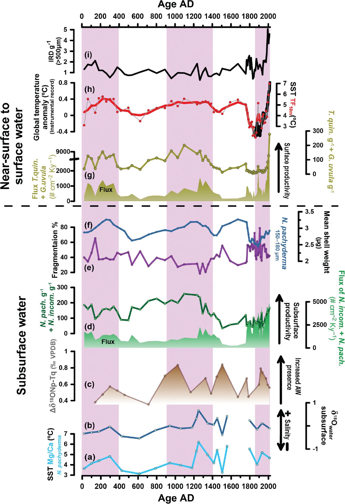 The δ18O values of N. pachyderma and T. quinqueloba generally show an increasing trend with lower δ18O values from about 1800 AD (Fig. 4ac). The record of T. quinqueloba is more variable than the record of N. pachyderma. The δ18O values of G. uvula show the opposite trend of the other two species, but of lower amplitude. The δ13C values of N. pachyderma, T. quinqueloba and G. uvula show similar trends until about 1800 AD (Fig. 4df). The δ13C values of G. uvula are low between about 400 AD and about 1770 AD but are otherwise high.