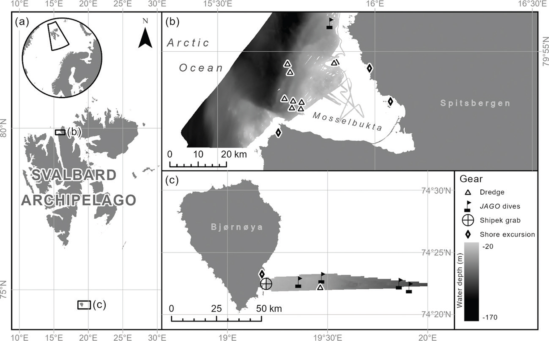 Fig. 1 Map of the (a) Svalbard Archipelago and bathymetry for (b) Mosselbukta and (c) Bjørnøy-Banken (east of Bjørnøya), including stations for sample collection and applied gear of recovery (station metadata are listed in Table 1).