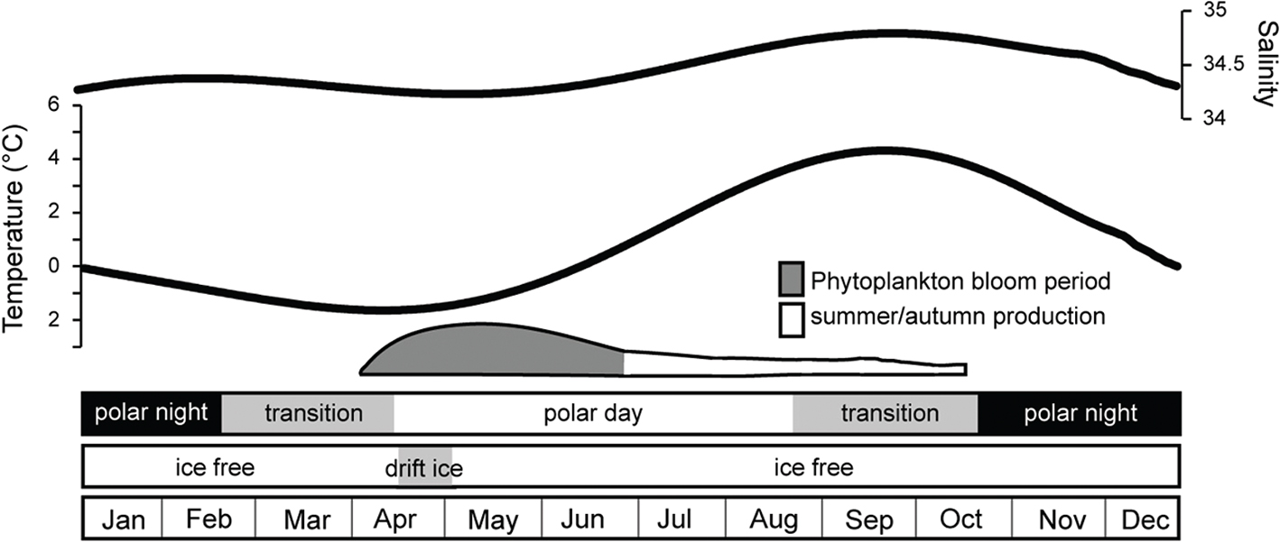 Fig. 2 Schematic overview of the seasonality at Mosselbukta. (Salinity and temperature data for 2006 simplified after Wisshak et al. [2019]. Phytoplankton bloom and subsequent summer/autumn production based on Zenkevitch [1963]. Polar night and day data retrieved from the NOAA Global Monitoring Laboratory [2020]. Ice data for 2016 obtained via the ice chart archive of the Norwegian Meteorological Institute [2019].)