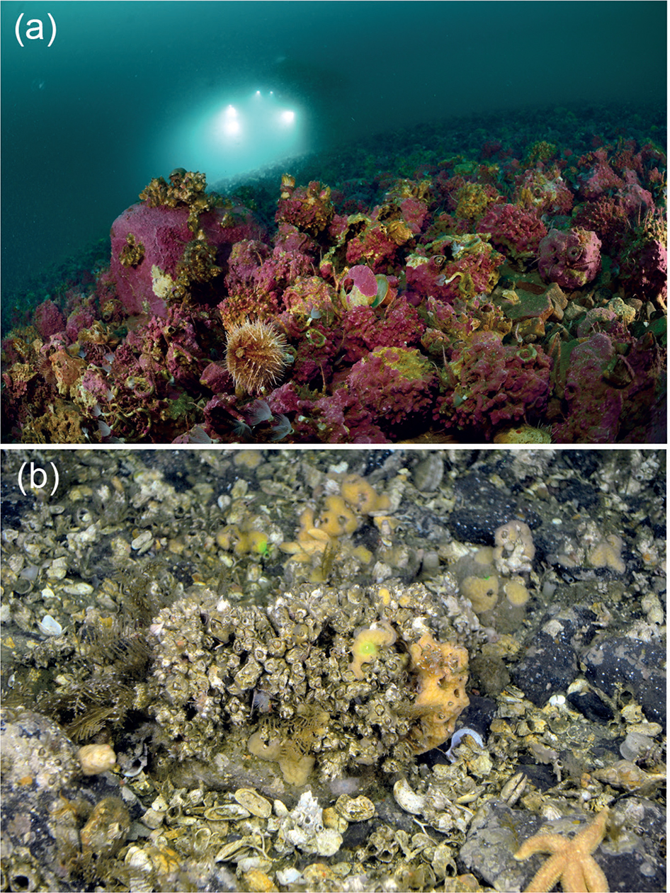 Fig. 3 The seafloor in Svalbard carbonate factories, illustrating the abundance of balanids at (a) the rhodolith beds in Mosselbukta (ca. 45 m water depth; submersible JAGO in the background; photo courtesy of Solvin Zankl) and at (b) the carbonate platform at Bjørnøy-Banken (ca. 100 m water depth).