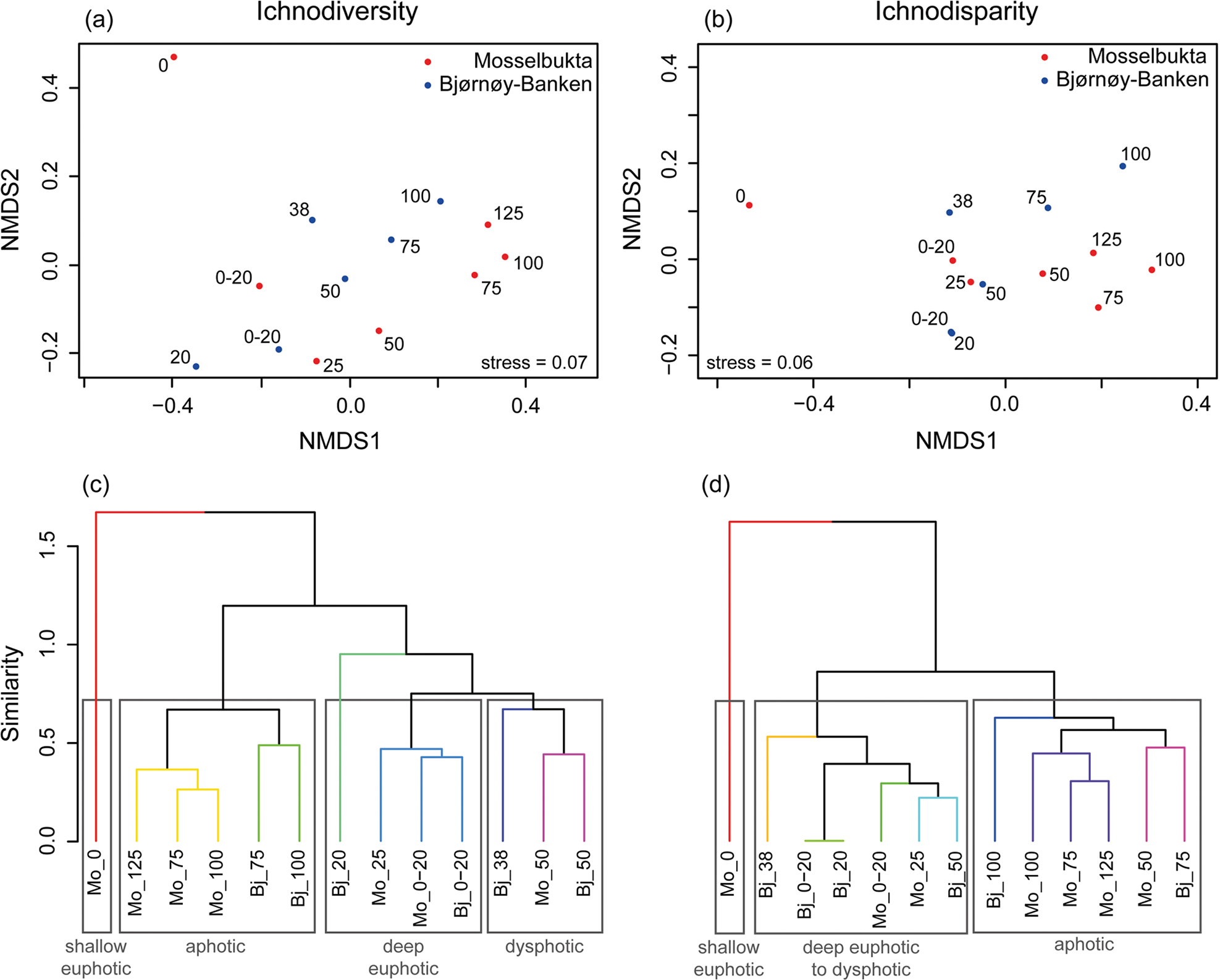 Whilst ichnodiversity reflects the number of species (ichnotaxonomic richness), ichnodisparity is “a measure of the variability of morphologic plans” (Buatois et al. 2017:104) and is based on a classification into categories of architectural designs. Within each of these architectural groups present in our data set, there may be different ichnospecies (Table 4). A high ichnodiversity does not necessarily mean that the ichnodisparity is also high (see figure 80 in Buatois et al. 2017); likewise, the same degree of ichnodisparity does not mean that the same architectural designs are present. The application of the ichno-disparity concept as a complementing approach did not yield clear differences between the two sites or between the various water depths (low R values and significance levels). The ichnodisparity indices (Fig. 8c, f) and the NMDS plot (Fig. 7b) draw a similar picture, with only the intertidal station in Mosselbukta showing a different signature that is most likely a result of the low ichnodiversity in the initial microboring trace assemblage (see discussion above). The cluster analysis (Fig. 7c, d) for ichnodiversity and ichnodisparity, however, differed in that the ichnodiversity showed four distinct clusters related to the different photic zones, whereas the architectural groups showed three distinct clusters, which are related to “shallow euphotic”, “deep euphotic to dysphotic” and “aphotic” conditions. The diversity in the architectural designs and, therefore, boring behaviour by microendoliths differs to some degree throughout the bathymetric transect, but not between the different sites (Fig. 7d). The clustering is statistically not significant, however, probably reflecting a combination of microborings by phototrophs and organotrophs within the different groups. Categories including ichnotaxa by phototrophs occurred primarily in the photic zone (e.g., “globular to spherical borings”, “radial borings”), but as the bacterial ichnogenus Scolecia belongs together with Ichnoreticulina and Conchocelichnus to “branched tubular borings”, the design persists throughout the bathymetric transect.