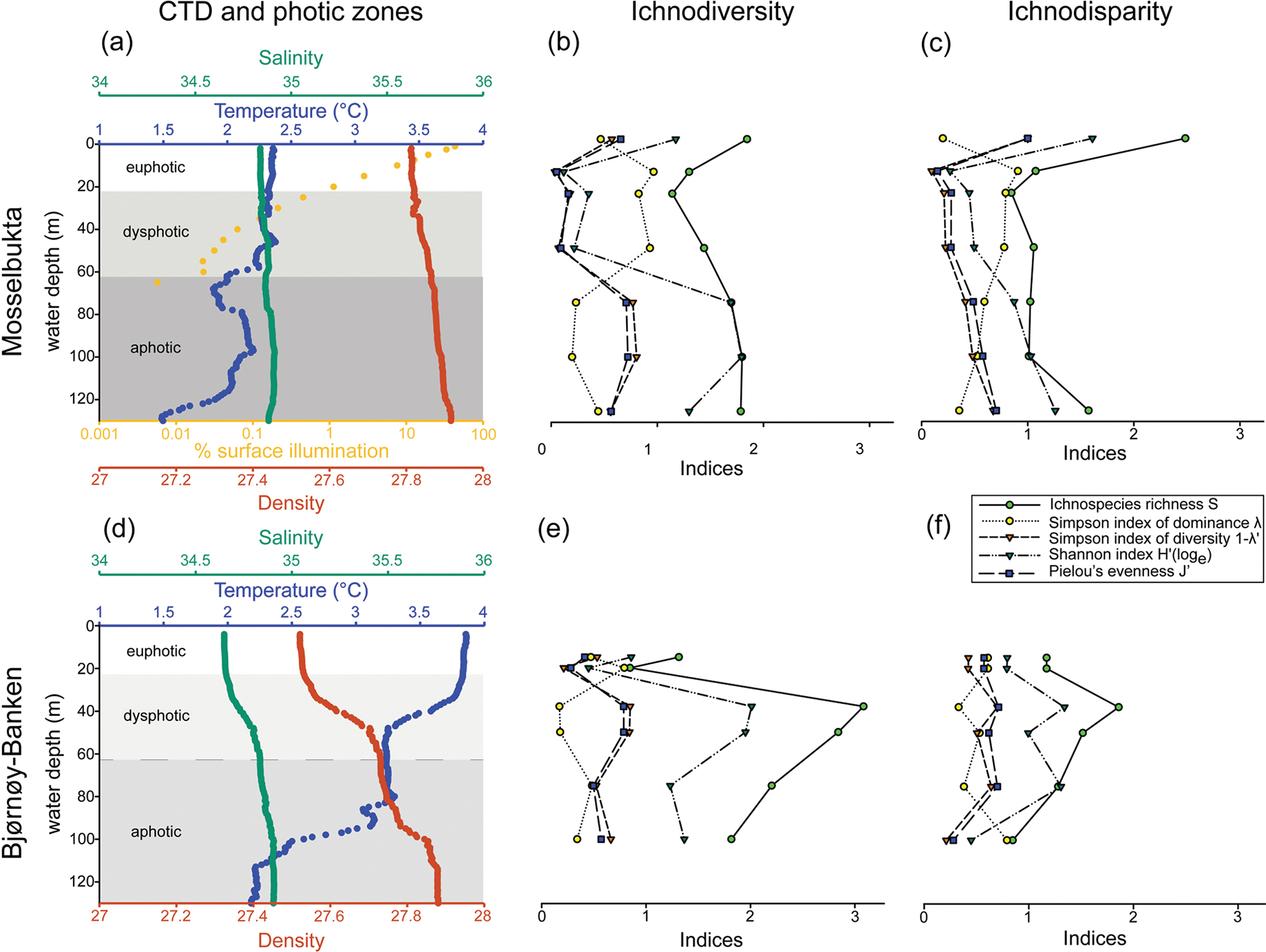 Fig. 8 Assessment of diversity indices for (b) and (e) ichnodiversity and (c) and (f) ichnodisparity across the bathymetrical transect (a)–(c) at Mosselbukta and (d)–(f) at Bjørnøy-Banken. Salinity, temperature and density data (Wisshak et al. 2017) were plotted with light intensities expressed as percent of the surface illumination in the logarithmic plots shown in (a) and (d) (light intensity data from Teichert et al. 2014). As no light intensity data were available for (d) Bjørnøy-Banken, the photic zonation in Mosselbukta is used as an approximation.