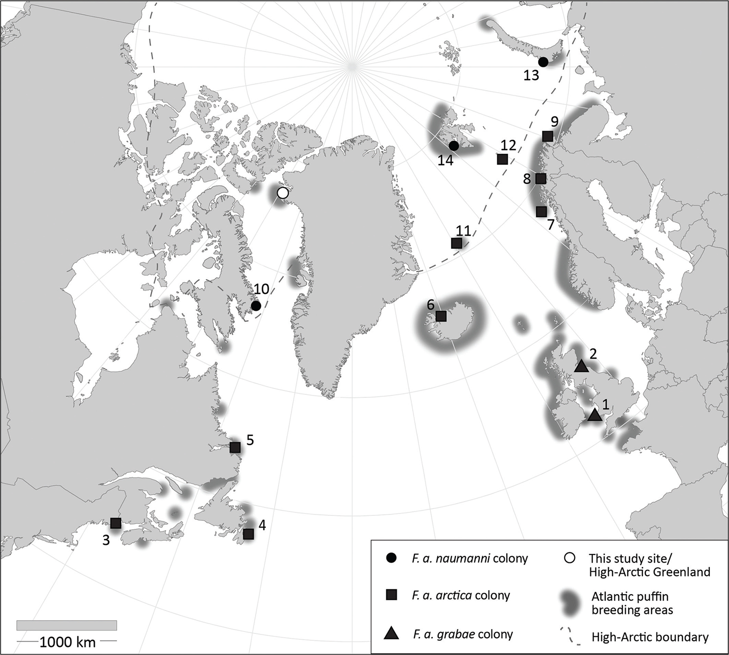 Figure 1 Breeding distribution of Atlantic puffin (Fratercula arctica) and locations of places mentioned in the text and Table 2 are as follows. (1) Skomer Island; (2) Isle of May; (3) Machias Seal Island; (4) Gull Island; (5) Gannet Islands; (6) Baer; (7) Røst; (8) Troms; (9) Hornøy; (10) Baffin Island (single naumanni individual collected, possible colony present but of unknown subspecies); (11) Jan Mayen; (12) Bjørnøya; (13) Novaya Zemyla; (14) Svalbard (main group of islands). Figure based on Gaston & Jones (1998) and Lowther et al. (2020). High-Arctic boundary from Kurvits et al. (2010).