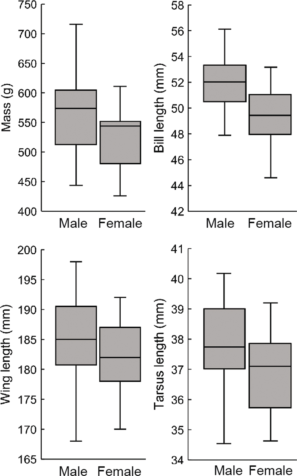 Figure 2 Boxplots for mass, bill, wing and tarsus length of Atlantic puffins from Dalrymple Rock, High-Arctic Greenland.