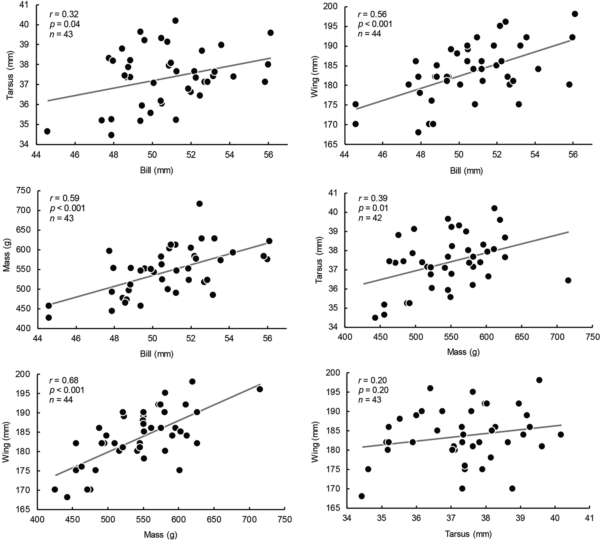 Figure 3 Correlations between body size measurements for adult male and female Atlantic puffins captured from 2010 to 2015 at Dalrymple Rock, High-Arctic Greenland.