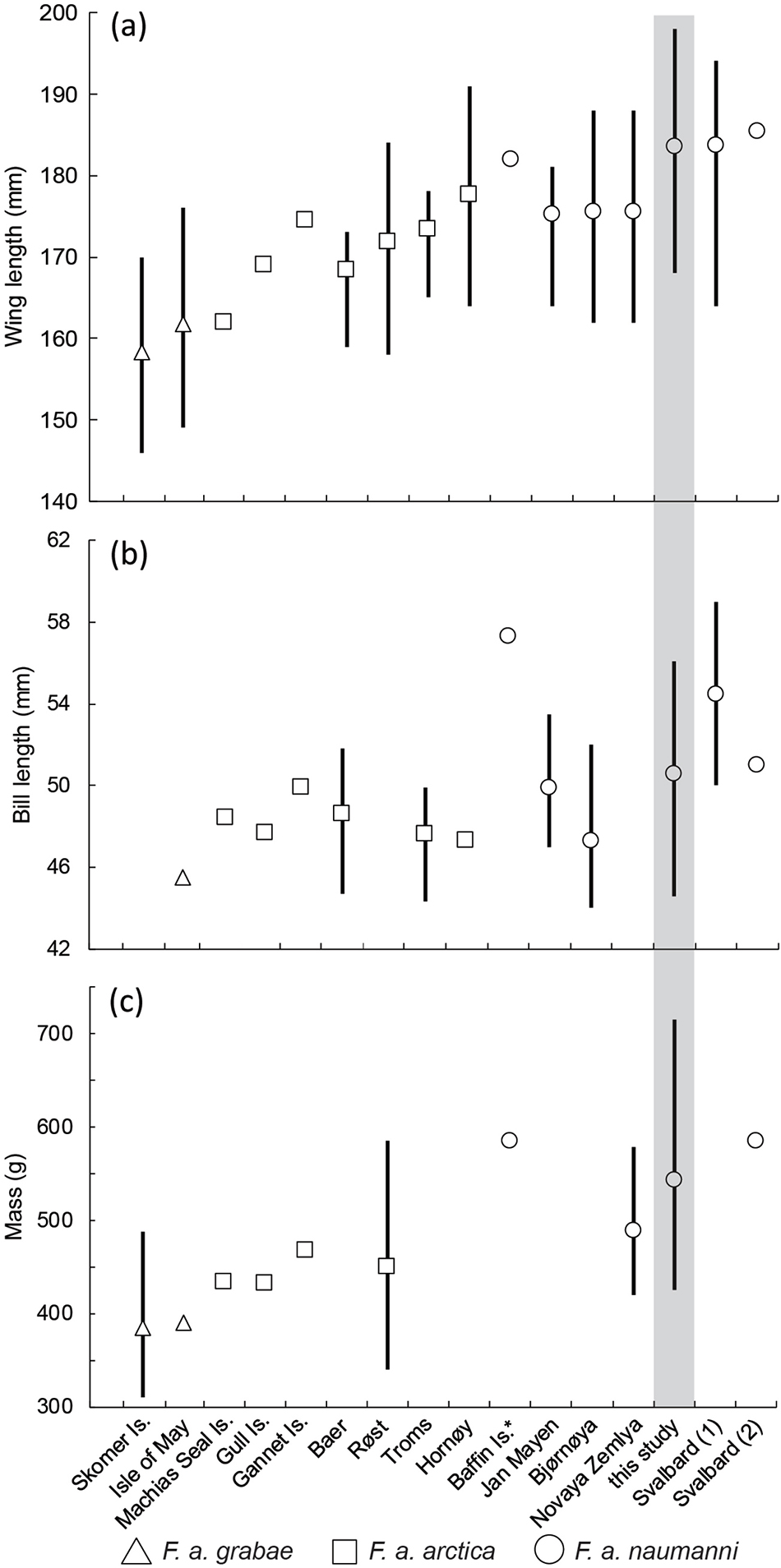 Figure 4 Measurements for (a) wing length, (b) bill length and (c) mass of Atlantic puffins from Fratercula a. grabae, arctica and naumanni colonies arranged left to right by subspecies and latitude. Symbol indicates the mean, and bars indicate the range. Measurements are not available for all locations and have been left blank. See Fig. 1 for locations of colonies and Table 2 for exact means, ranges and sources of data. Svalbard (1) is from Le Roi (1911), and Svalbard (2) is from Underwood (2019). The asterisk indicates a single individual. Measurements from this study are shaded.
