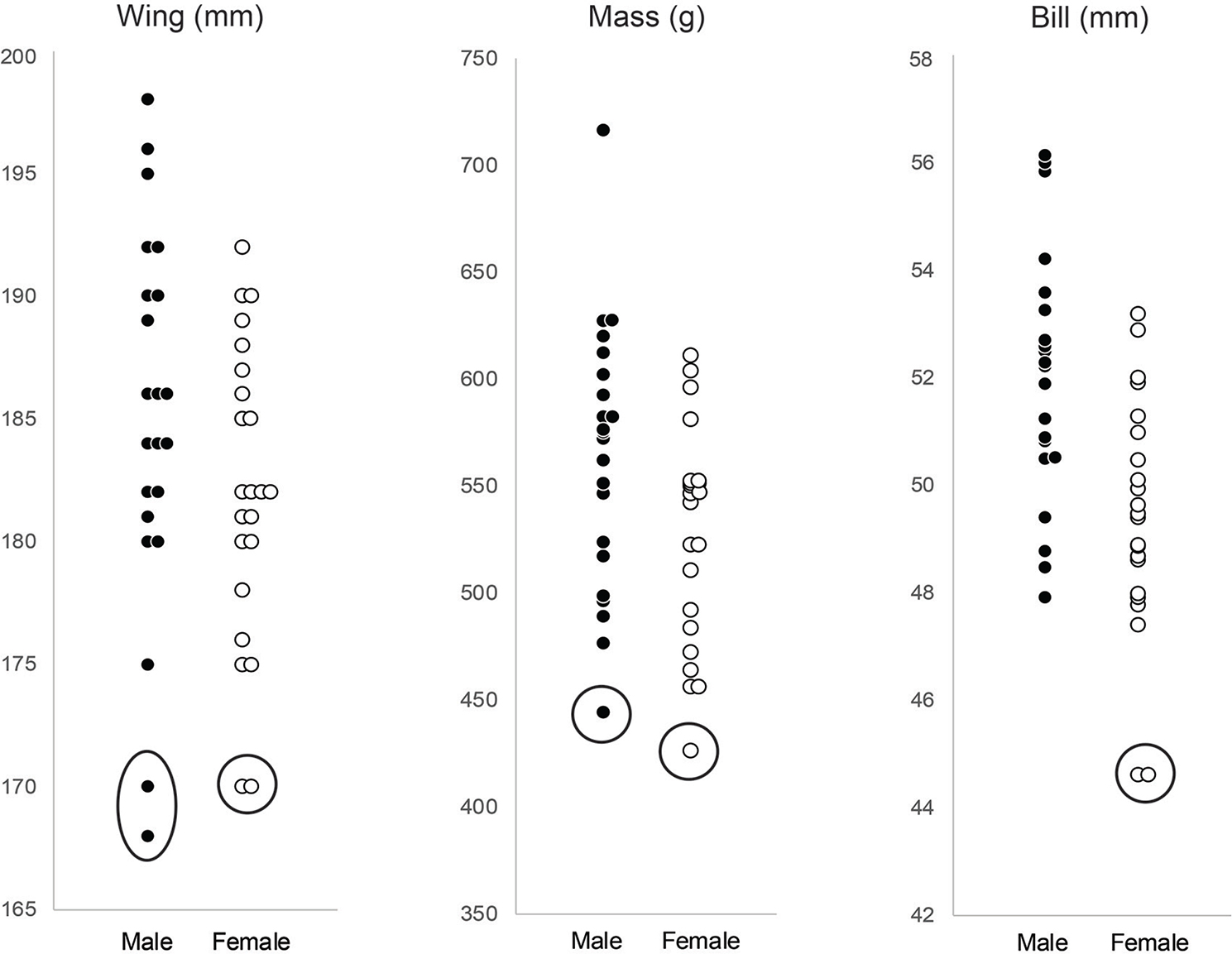 Figure 5 Measurements of individual Atlantic puffins captured at Dalrymple Rock. Circled samples indicate individuals which may meet Salomonsen’s (1935) definition of “mutant.”