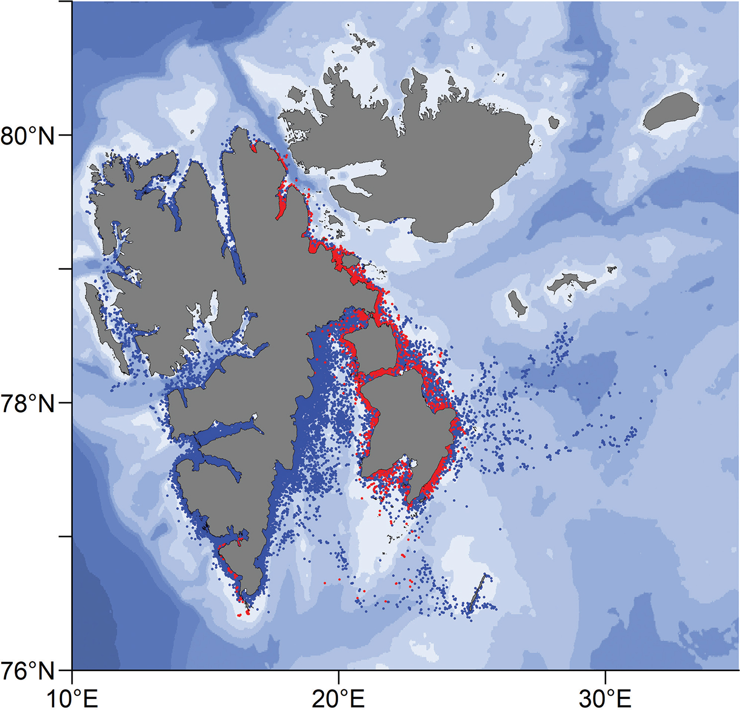Fig. 2  Map showing all positions received from tracking studies of white whales in Svalbard. Location points are from 1897 tracking days for 34 males (blue dots) and 158 tracking days for four females (red dots).