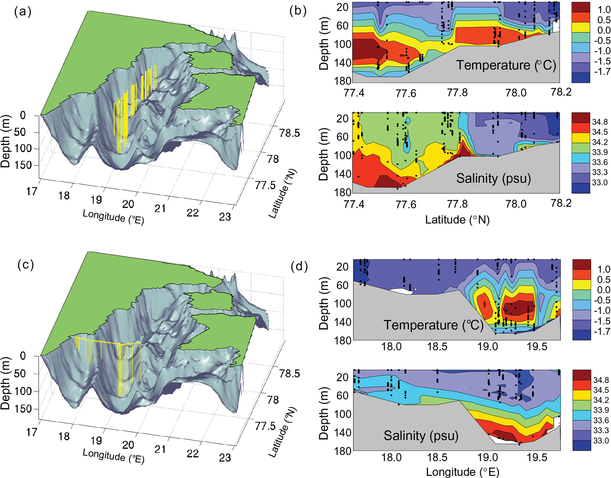 Fig. 3  CTD transects in Storfjorden, Svalbard. The maps show the locations of selected dives performed by a white whale (each yellow spike represents a dive; the length of the spikes represents dive depth) carrying a CTD tag, along (a) a north–south transect and (c) an east–west transect superimposed on a three-dimensional bathymetric map of Storfjorden, Svalbard. CTD casts produced during these dives are the basis for the temperature and salinity profiles shown in (b) and (d), respectively. Each dot in (b) and (d) represents a location where a CTD measurement was taken. (Figure from Lydersen et al. 2002.)