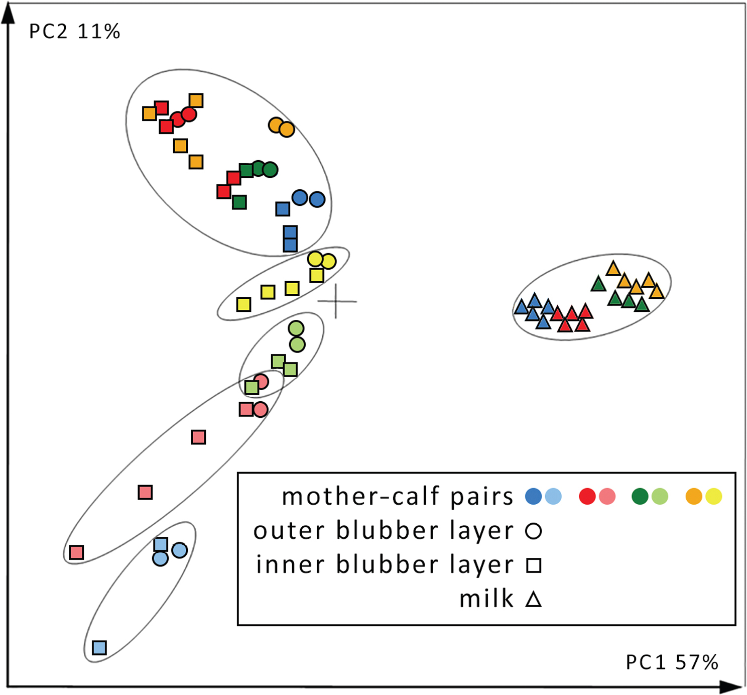 Fig. 4  Biplot of the fatty-acid composition in blubber samples from white whale mothers and calves and in milk samples. The calf in the mother–calf pair represented in blue was the youngest, followed by red, green and yellow (the oldest calf). (Figure modified from Birkeland et al. 2005.)
