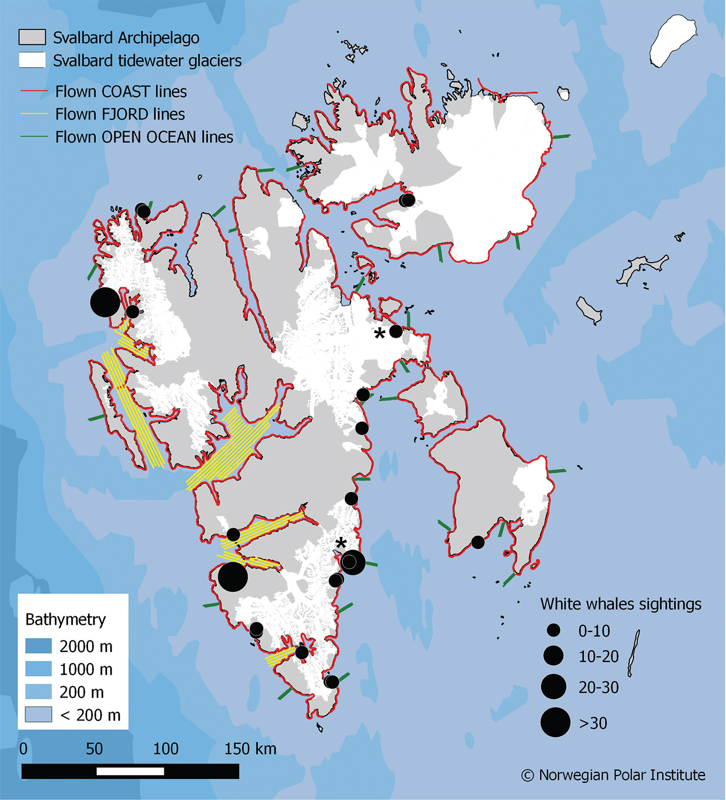 Fig. 5  Locations of white whale sightings during an aerial survey of Svalbard, Norway, summer 2018. Asterisks represent mother–calf pair sightings. Red lines represent coastlines surveyed, yellow lines the transects flown in the fjords on the west coast of Svalbard and green lines show offshore transect lines flown from shore to offshore areas perpendicular to the coastline. (Figure from Vacquie-Garcia et al. 2020.)