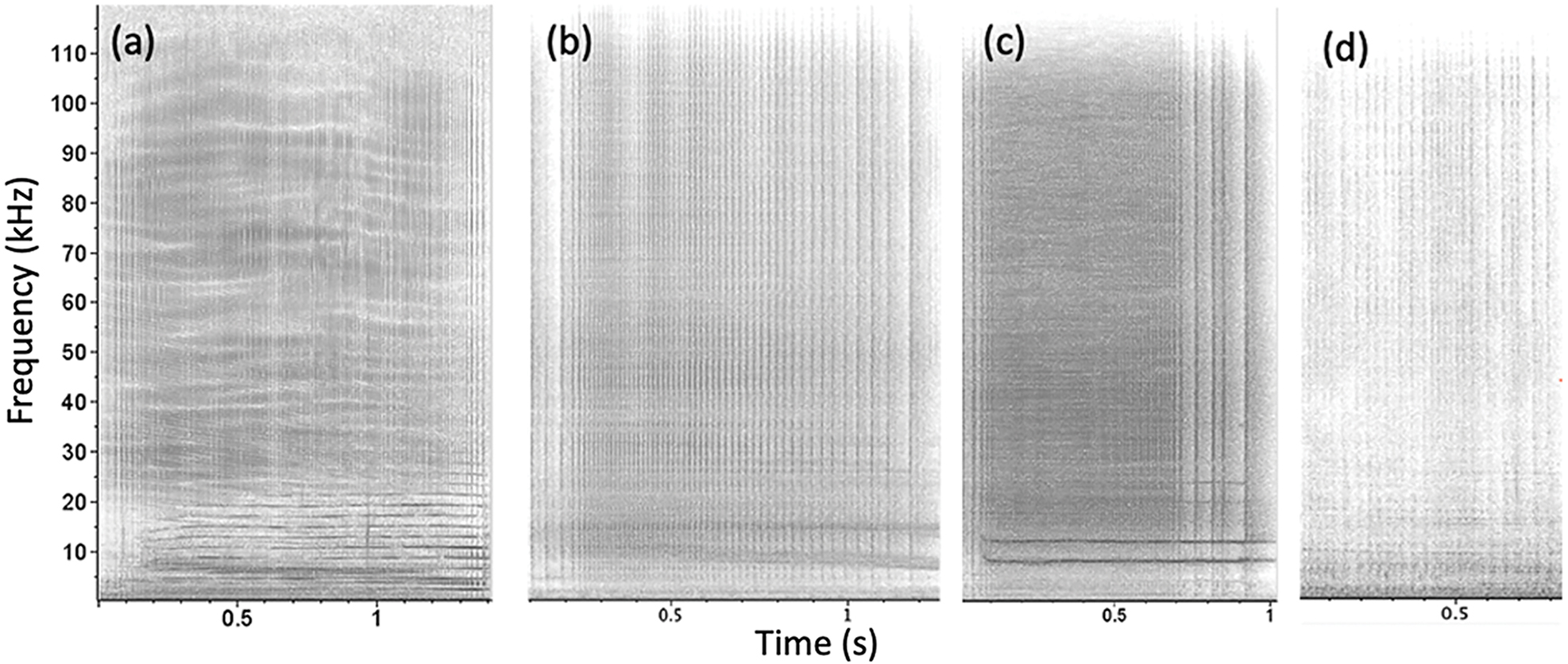 Fig. 1 Representative spectrograms of the contact call data sets used for our ASL estimates (FFT at 2048 points with a 50% overlap, Hann window): (a) SLE (DLT18003), (b) Oceanogràfic aquarium female, (c) Oceanogràfic aquarium male, (d) Oceanogràfic aquarium three-day-old calf.