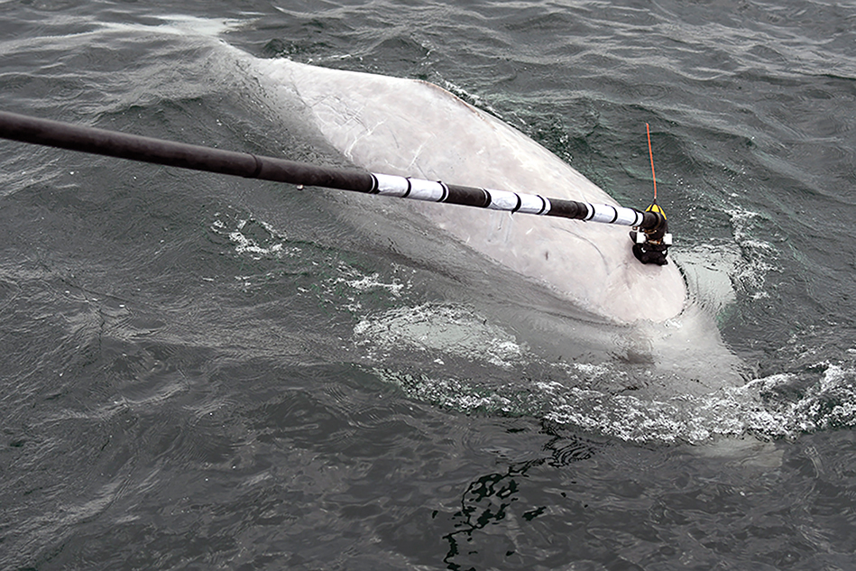Fig. 2 DTAG deployment on a sub-adult beluga, using a handheld carbon fibre pole, within 1 m of the blowhole.