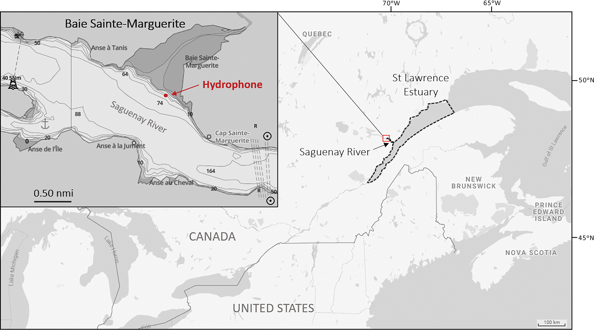 Ambient noise recordings took place at Baie Sainte-Marguerite, a small delta at the confluence of the Saguenay and Sainte-Marguerite Rivers, 12 nautical miles upstream from the mouth of the Saguenay Fjord, in the SLE, Canada (Fig. 3). This bay is an area of high residency for female belugas and their calves, used for socialization and resting and where females care for their young (Lefebvre et al. 2012; DFO 2018). The depth is 118 m in the centre of the Saguenay at its deepest channel, decreasing to 10 m closer to the head of the Sainte Marguerite River. Only 1.5 km separate the bay’s intertidal zone from the opposite shore of the Saguenay River, and this, in addition to the steep bathymetry of the area, means that any vessel entering the bay or transiting the river, ensonifies the whole area from shore to shore.