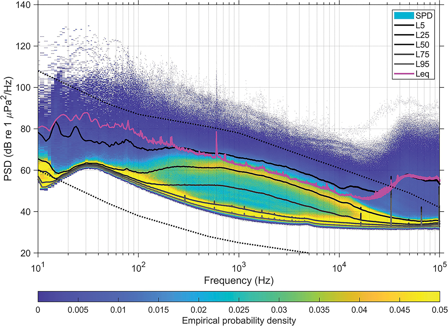Fig. 4 Power spectral density levels over the 23-day recording period at Baie Sainte-Marguerite. SPD is the spectral probability density. L5, L25, etc. are exceedance levels (i.e., L5 means sound levels exceed this 5% of the time). Leq is the rms level. Wenz lines are the limits of prevailing noise (Wenz 1962).