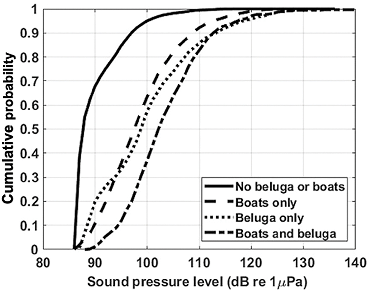 The Leq (equivalent rms sound level) showed some short duration but high-amplitude events when integrated across the 23 days of data (Fig. 4). The bimodal distribution between 100 Hz and 10 kHz may be driven by beluga calls or boat noise. Figure 5 provides the broadband noise cumulative probability plots for 241 hours of recordings that were manually verified and split (minute by minute) into the four pre-defined categories. When belugas were present in the bay, vessel noise emanating from one or more vessels was confirmed 23% of the time (520/2271 minutes). In total, vessel noise was confirmed 19% of the time (2744/14 479 minutes). Splitting the manually verified recordings into daytime and nighttime hours (sunrise 05:30 to sunset 20:00), vessel noise occurred during 24% of the daytime recordings (2540/10 729 minutes) and 5% of the nighttime recordings (204/3751 minutes).