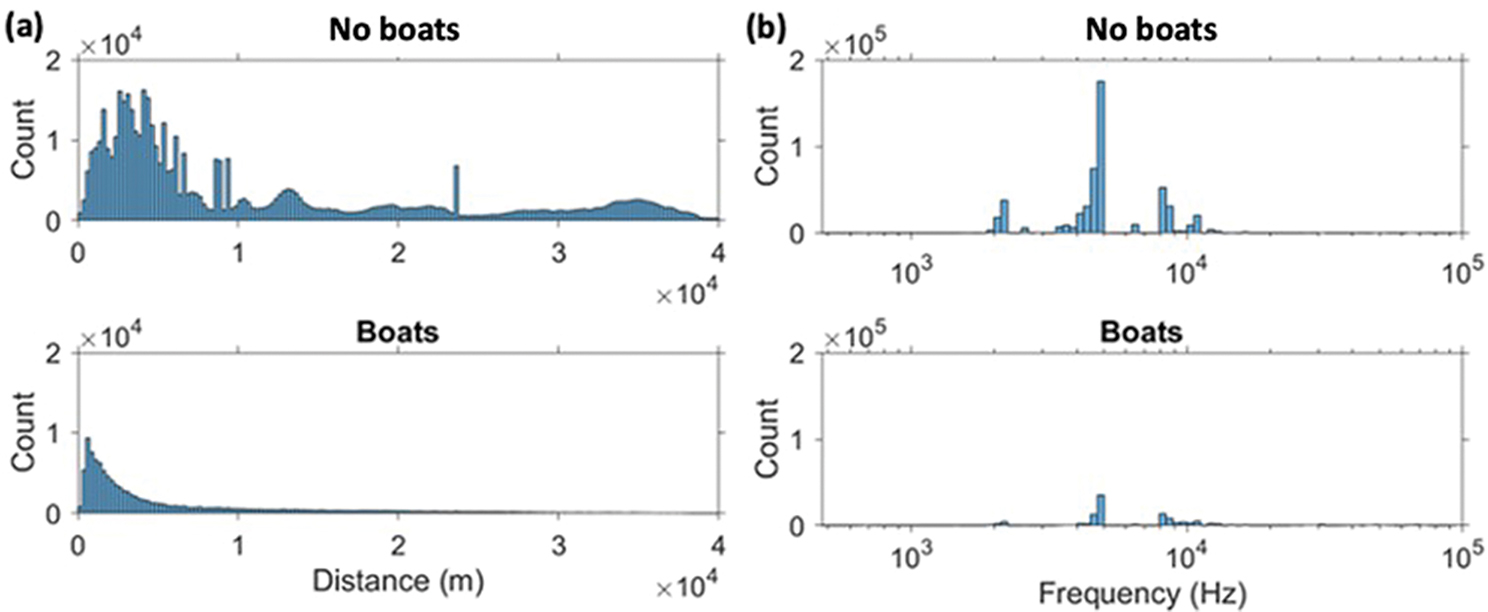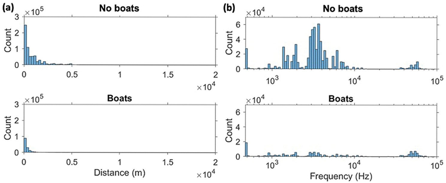 Fig. 8 Histograms showing distribution curves of modelled maximum communication ranges using calls recorded from a newborn beluga at Oceanogràfic (Valencia). (a) Maximum communication distances under (top) ‘no boats’ and (bottom) ‘boats’ scenarios. (b) 1/12 octave centre frequencies of maximum communication distances under (top) ‘no boats’ and (bottom) ‘boats’ scenarios. The count on the y axis is the number of model iterations for each combination of one call and one-minute noise file that falls in a specific distance or frequency bin.