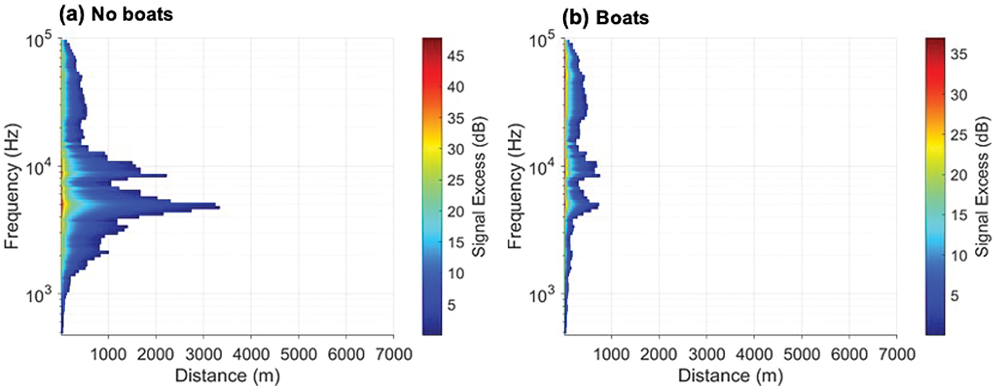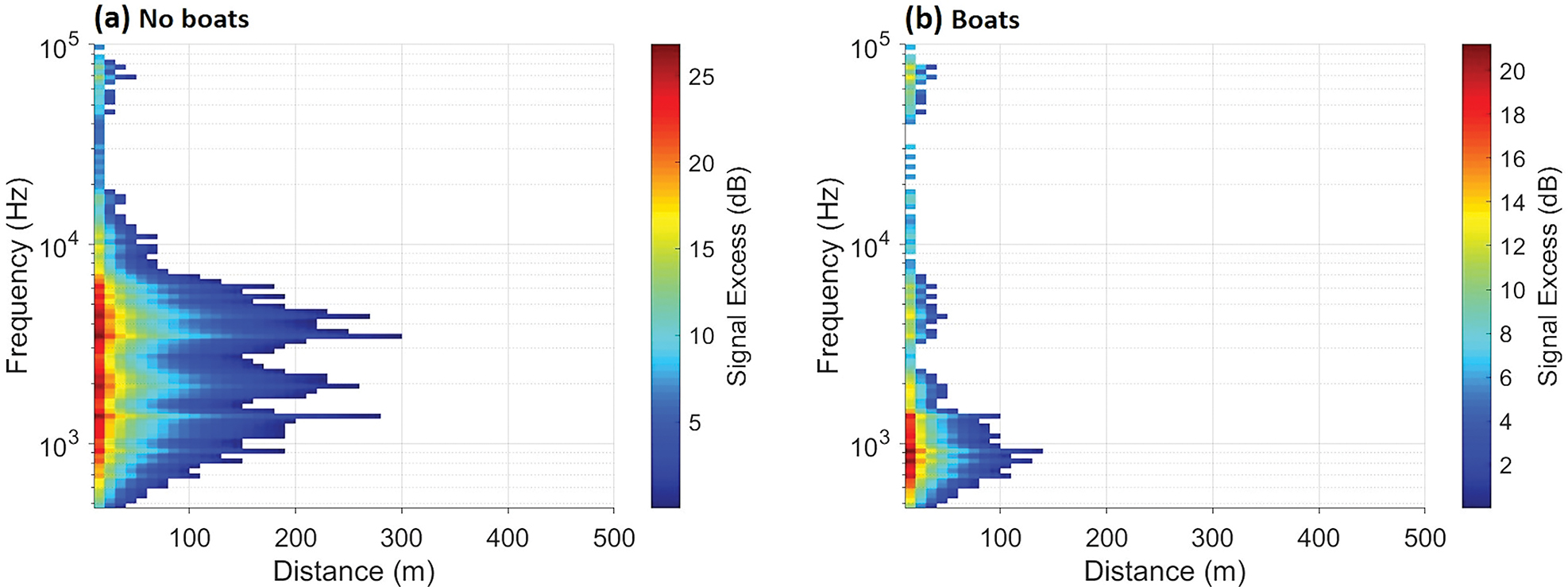 Fig. 9 Maximum communication range of each 1/12 octave band of a representative newborn beluga call in our data set (the call with the median source level, day 5 of life), under (a) ‘no boats’ and (b) ‘boats’ noise conditions. For each 1/12 octave band and at each distance, we subtracted the beluga hearing curve or the noise level, whichever was greater, from the received level. The ‘signal excess’ is the number of dB re 1 µPa that the beluga call is above the noise level or hearing curve.