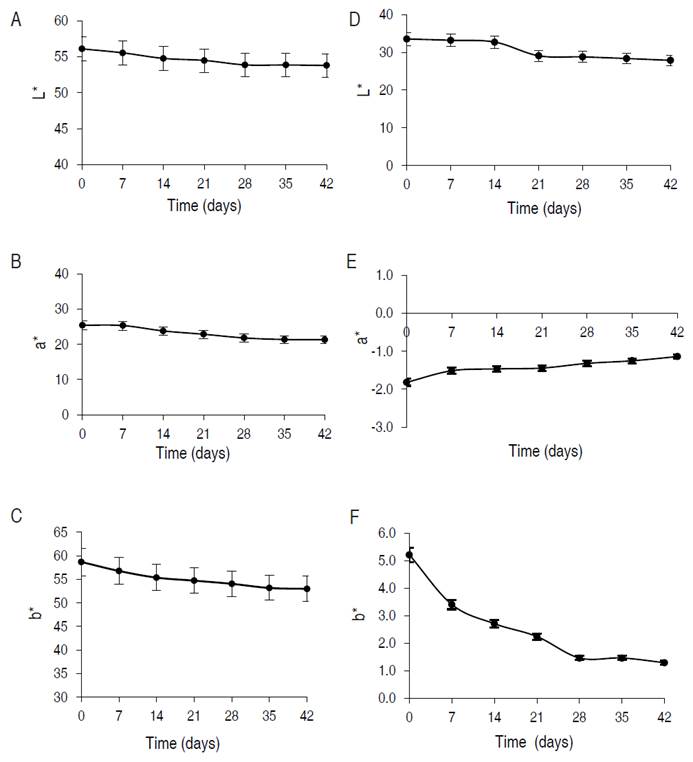 Figure 2: CIEL*a* b* color coordinates for pumpkin pulp (Cucurbita maxima) (A, B and C) and for peel (D, E and F), for 42 days. L*: CIE color space coordinate degree of luminosity, a*: CIE color space coordinate degree of green-red and b*: CIE color space coordinate degree of blue-yellow. The symbols represent the mean and the vertical bars the standard error for n=6.