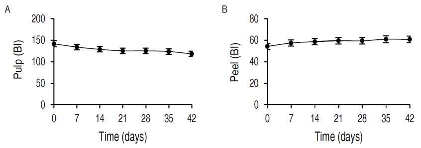 Figure 2 shows the results of the CIEL*a*b* color coordinates with L*=56.08±3.49; a*=25.39±2.18 and b*=58.67±5.41 as average values for the pulp for 42 days of storage, while the peel presented average coordinates of L*=33.50±3.28; a*=-1.81±1.76 and b*=5.21±3.88. This result denotes that the pulp is located in the universe of orange tones, while the peel presented green and blue tones, similar results were found by Saini et al. (2015).