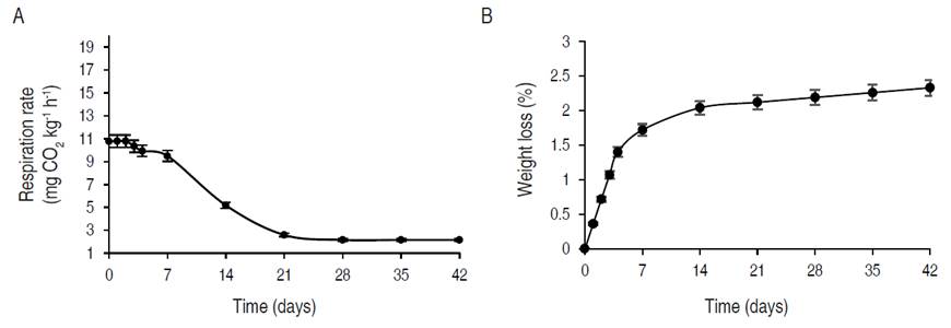Figure 4: Respiration rate (A) and weight loss (B) of accumulated weight (%) of pumpkin (Cucurbita maxima) during a period of 42 days, n=6