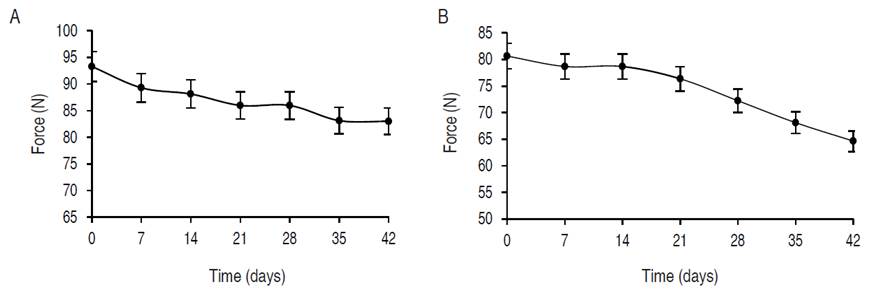Figure 5: Firmness force for pumpkin fruits (Cucurbita maxima) with peel (A) and without peel (pulp) (B) stored during 42 days. The symbols represent the mean and the vertical bars the standard error for n=6.