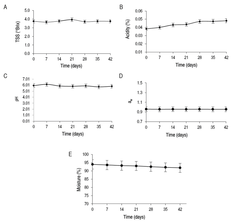 Figure 6: Total soluble solids (A), percentage of acidity (B), pH (C), water activity aw (D) and percentage of moisture (E), for pumpkin pulp (Cucurbita maxima) during a storage period of 42 days, n= 6.