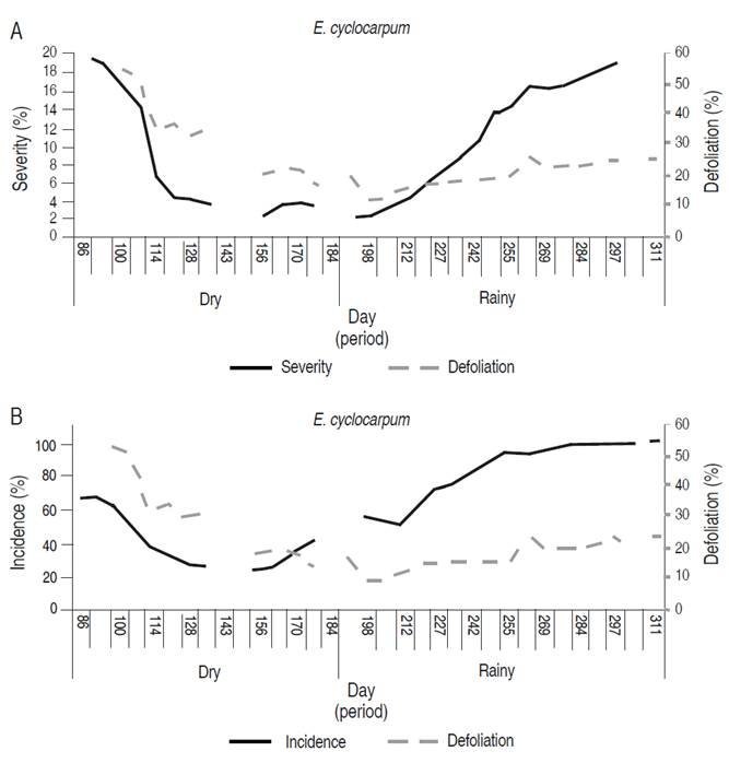 Figure 2: Development curve of foliar Anthracnose associated with Colletotrichum spp. in E. cyclocarpum. A. Severity and defoliation.