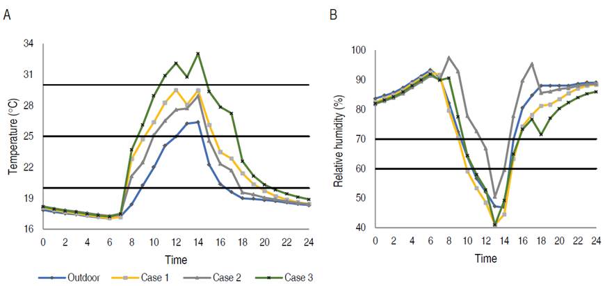 Figure 3: A. Average day temperature, B. Relative humidity of an average day of November for the three study cases.